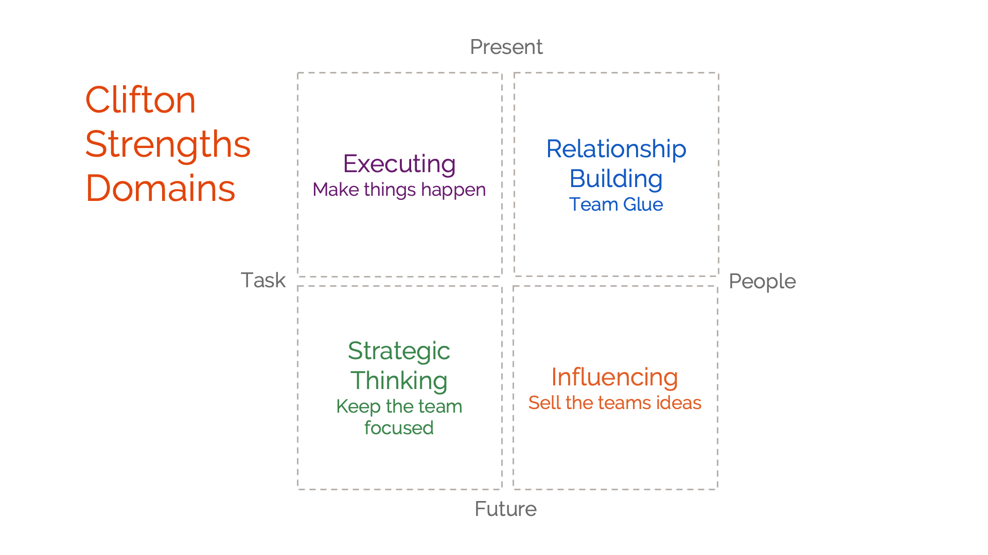 The CliftonStrengths Domains tool provides a shortcut to understanding a team’s strengths. Remembering all 34 themes can feel like a challenge, but by grouping them into common themes, things get a lot clearer. There are four core domains:
